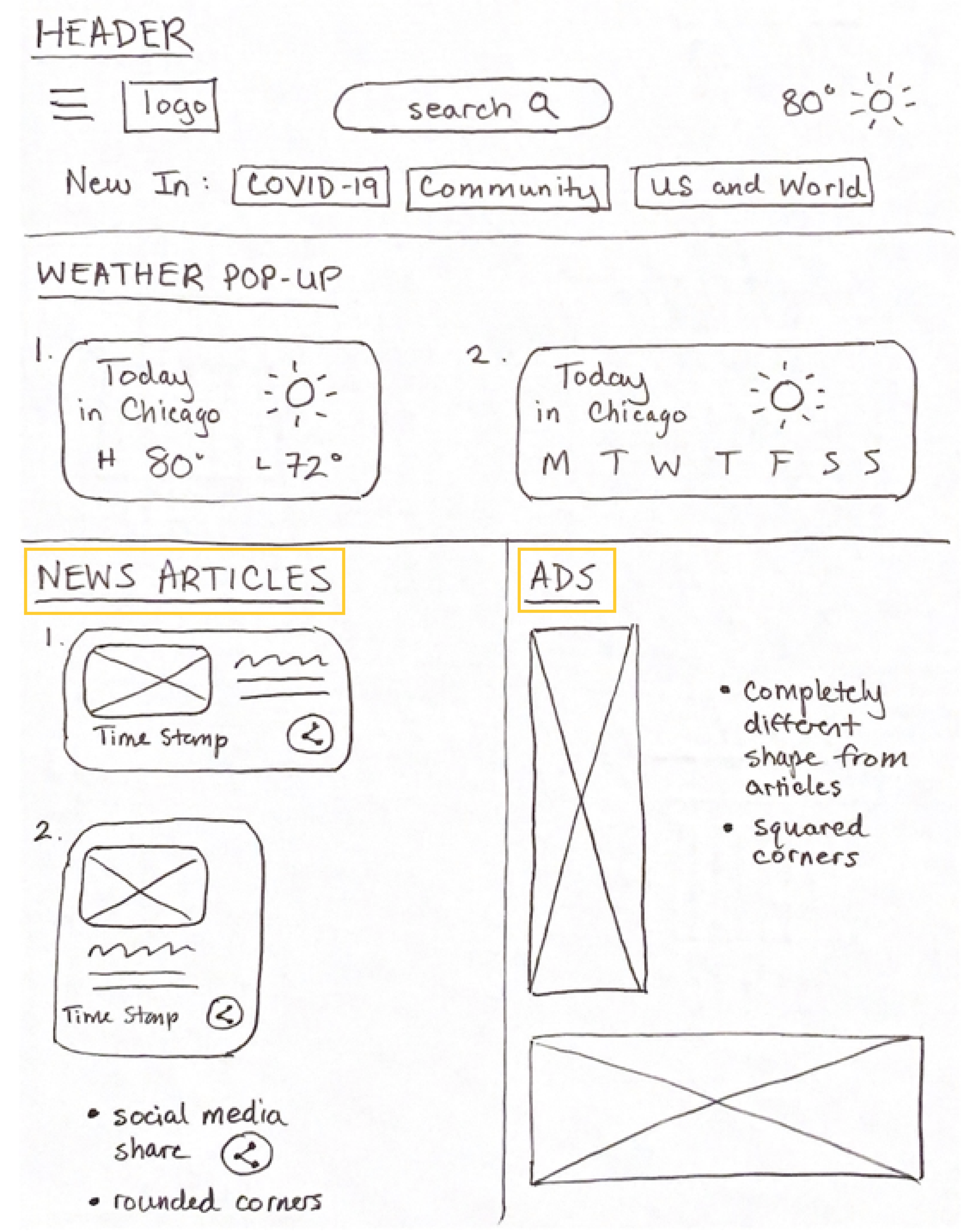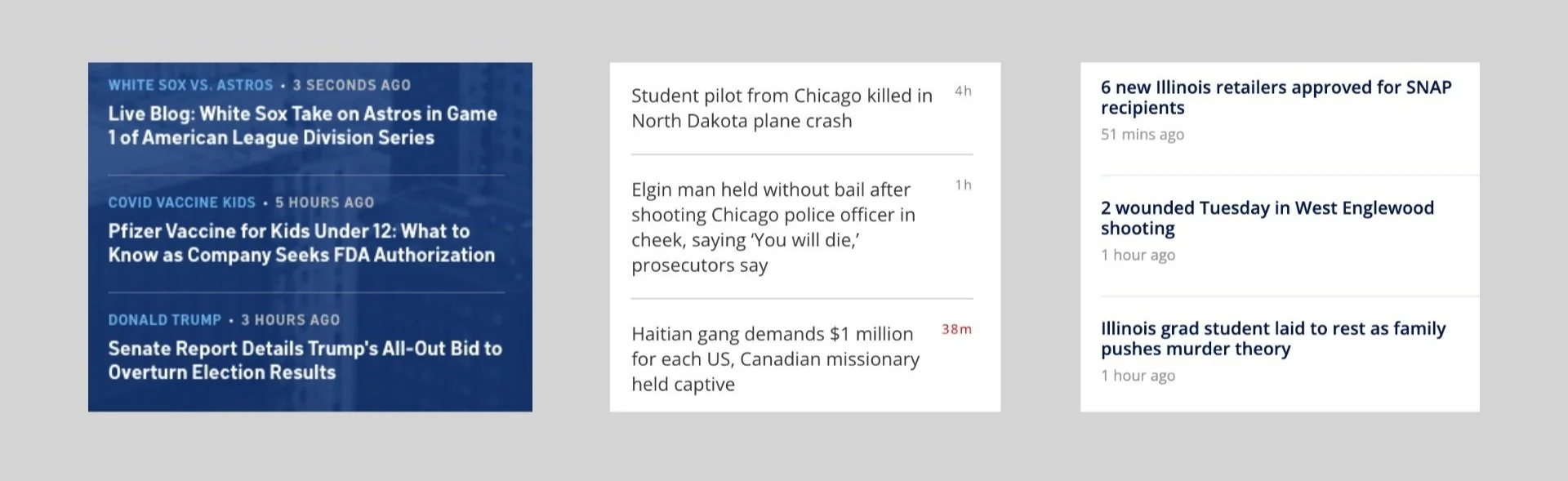 Next, to better understand industry conventions, my teammate performed a heuristic analysis while I conducted a competitive analysis and created a feature inventory, examining Chicago Tribune, NBC Chicago, and Fox32 Chicago.